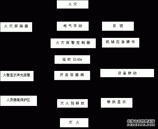 (3)應急機械啟動工作方式:用于控制器失效時,當職守人員判斷為火災時,應立即通知現場所有人員撤離現場,在確定所有人員撤離現場后,方可按以下步驟實 施應急機械啟動;①手動關閉聯動設備并切斷電源。②打開對應保護區選擇閥。③成組或逐個打開對應保護區儲瓶組上的容器閥,即刻實施滅火。